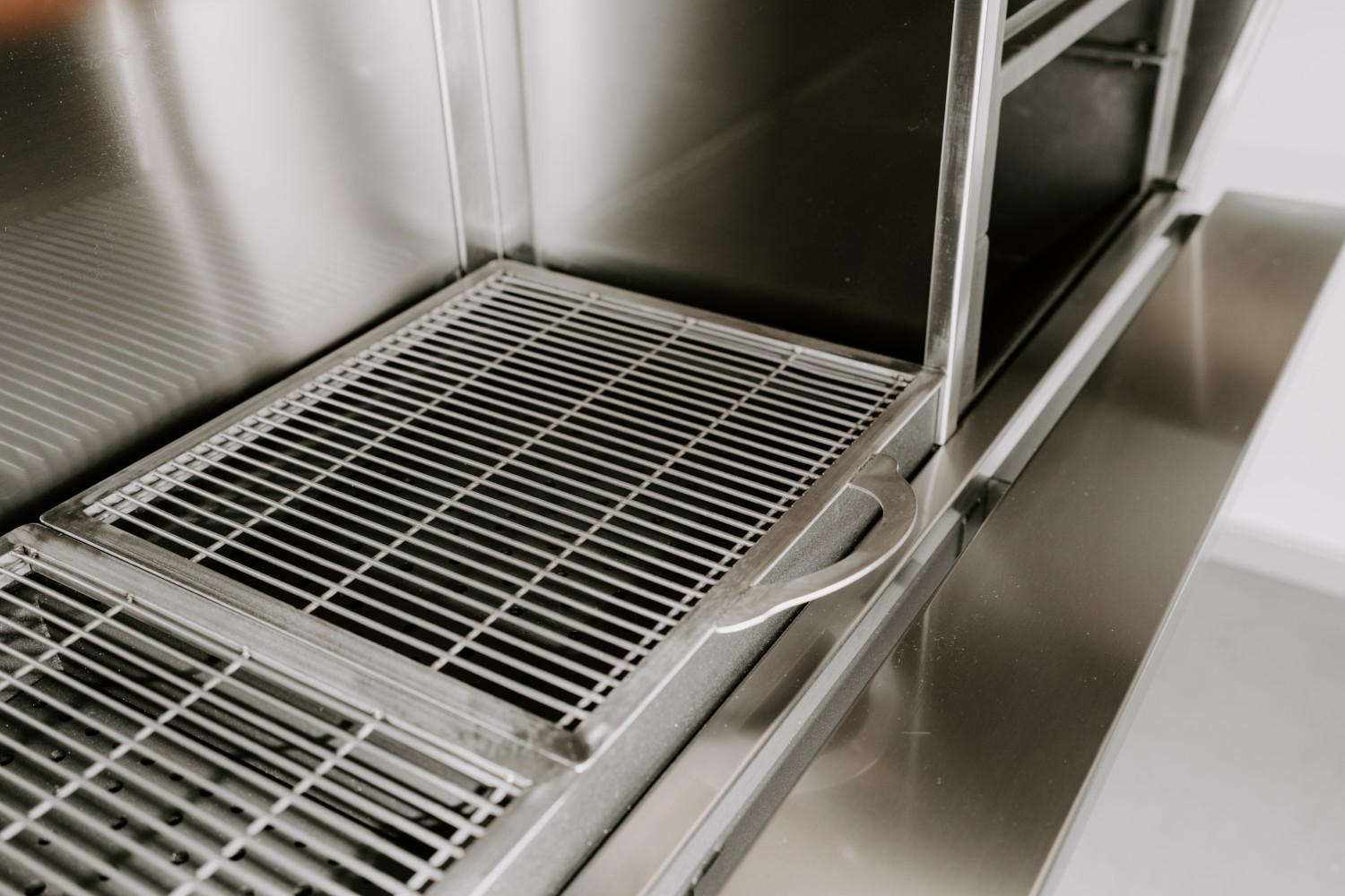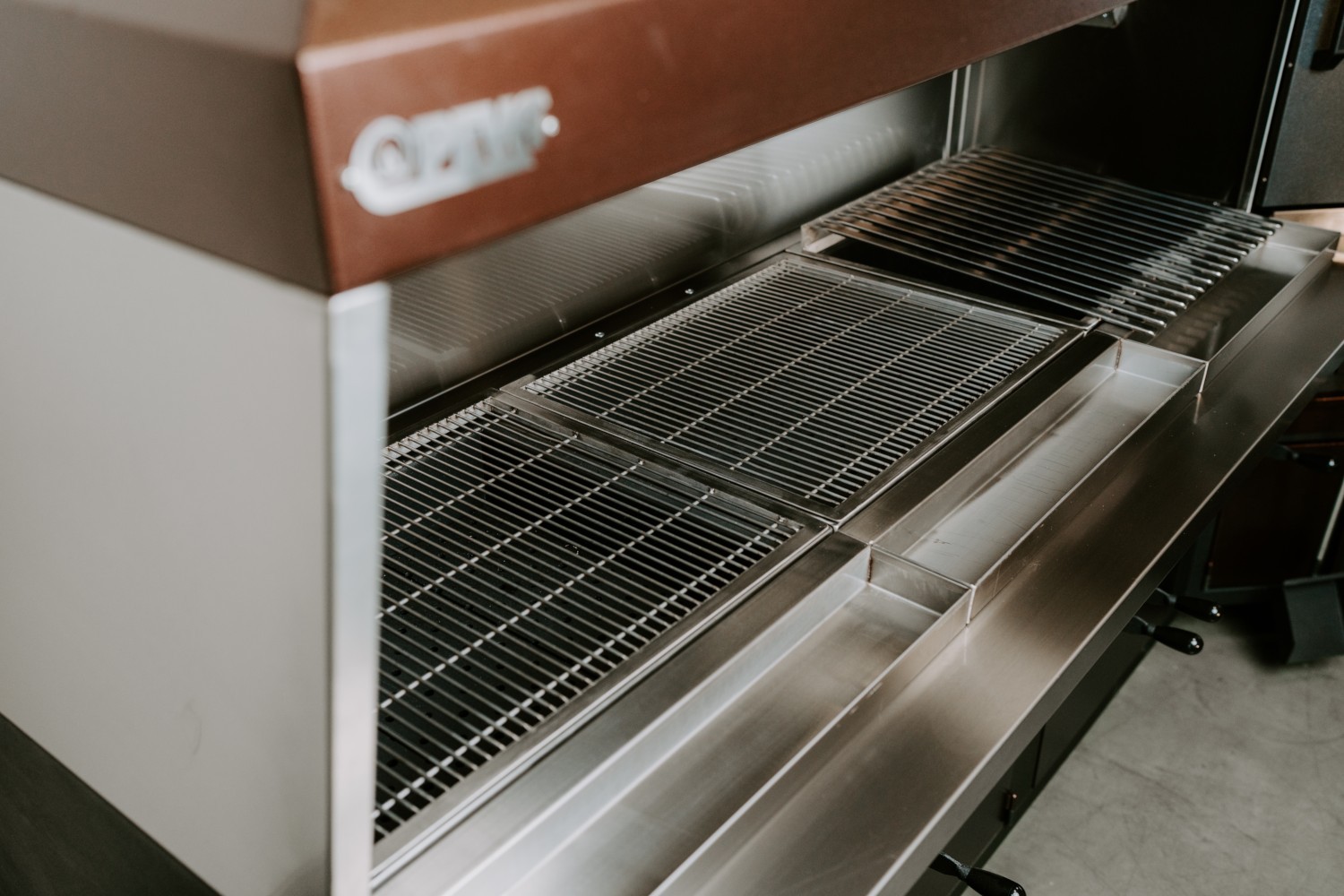 Le graticole sono realizzate in tondino di acciaio da 4 mm di diametro, consentendo una maggiore esposizione del cibo al calore, una migliore cottura ed una pulizia più facile. Possono essere a piano regolabile verticalmente oppure girevole, entrambi sono intercambiabili sullo stesso pozzetto. Struttura interna che evidenzia il meccanismo di sollevamento della griglia ed il cassetto per la raccolta delle ceneri.