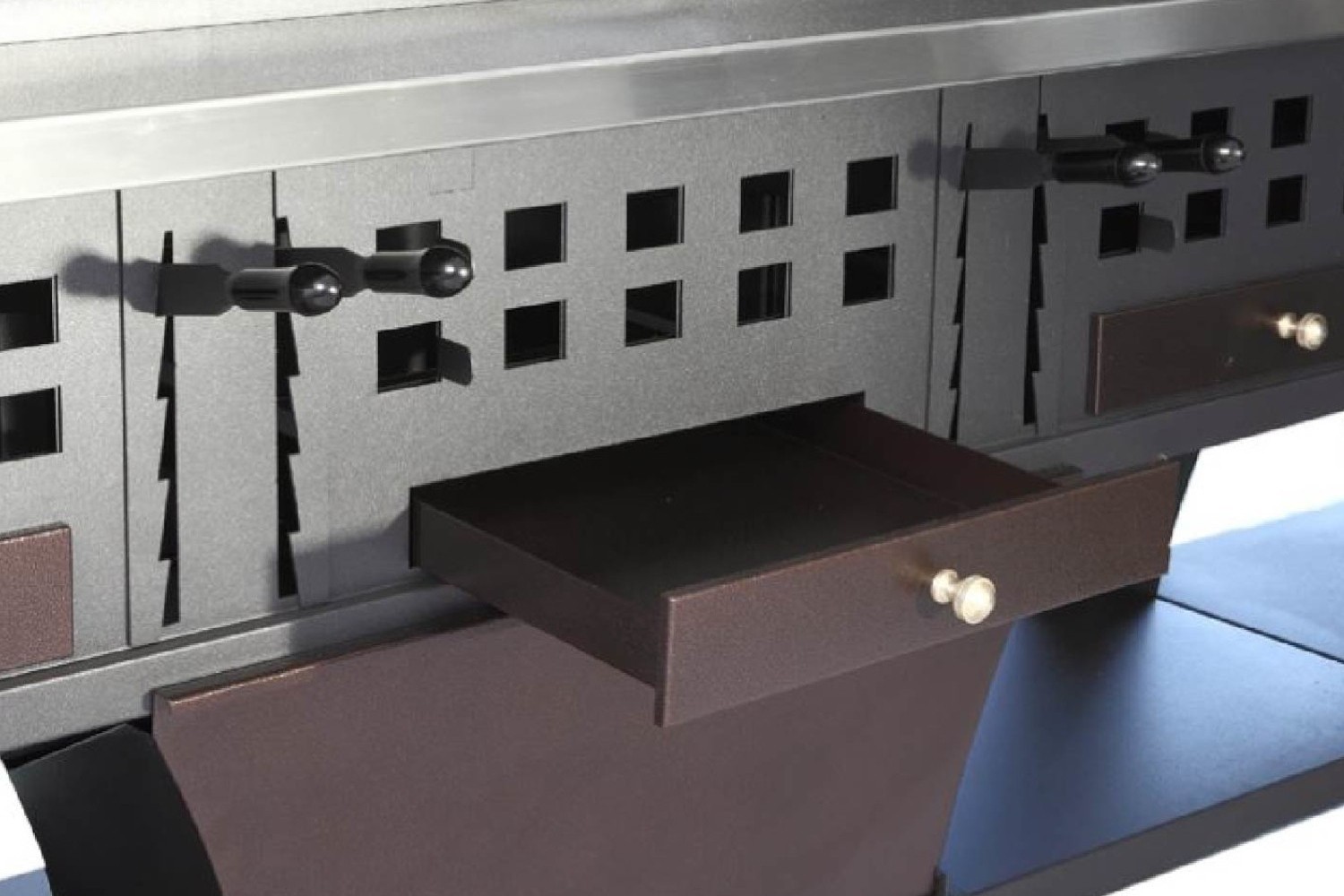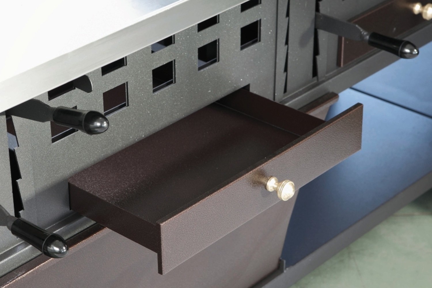 I cassetti sono facilmente estraibili, sopra essi vi sono delle feritoie regolabili millimetricamente per la corretta ossigenazione del carbone e per spegnere le fiamme, che si possono eventualmente generare. Il sollevamento e l’abbassamento del piano di cottura si ottiene mediante lo spostamento delle apposite leve sottostanti il piano di appoggio frontale. Sono regolabili in cinque posizioni, per consentire la corretta cottura di ogni pietanza.